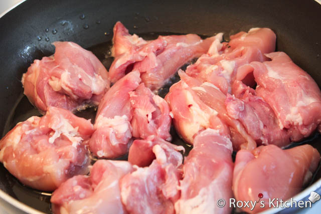 Heat the oil in a pan and brown the chicken in batches over medium heat. Drain on paper towels and transfer to a baking dish.