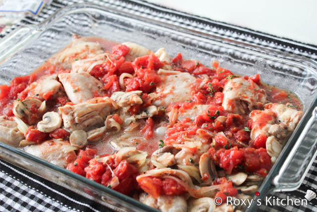 Combine the wine and tomato paste and pour over the chicken. Bake, covered, for 60 minutes, or until the chicken is tender.