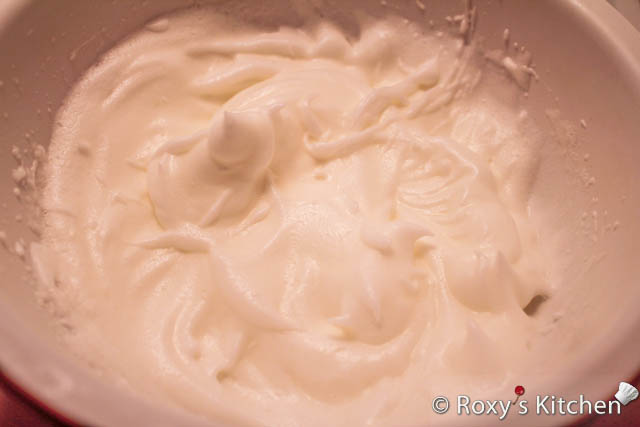 Whisk the egg whites on high speed until stiff peaks form. Carefully blend in the egg whites until just combined.